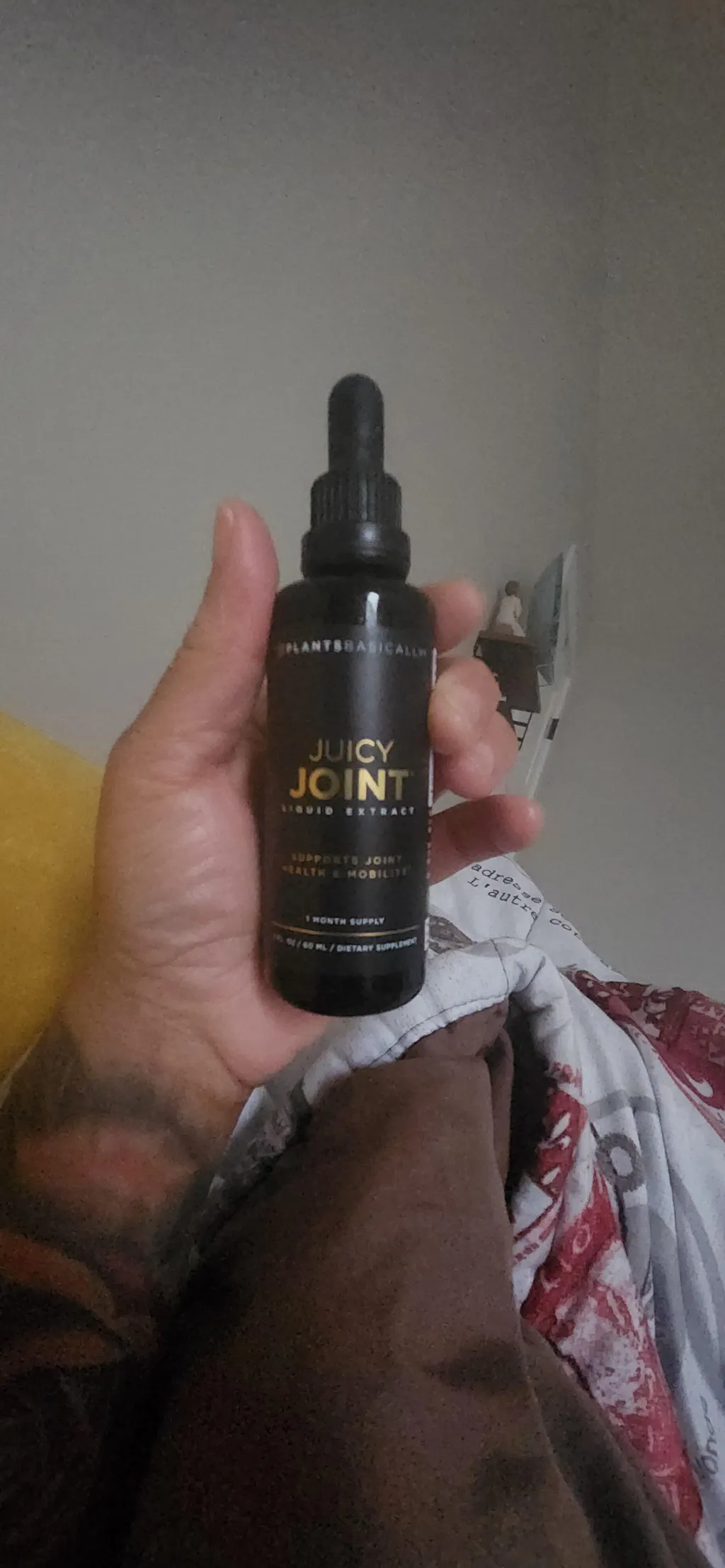 Ingredientes de Juicy Joint : raíz de cúrcuma, hierba reina de los prados, raíz de garra del diablo, corteza de sauce blanco, raíz de jengibre, pimienta negra.